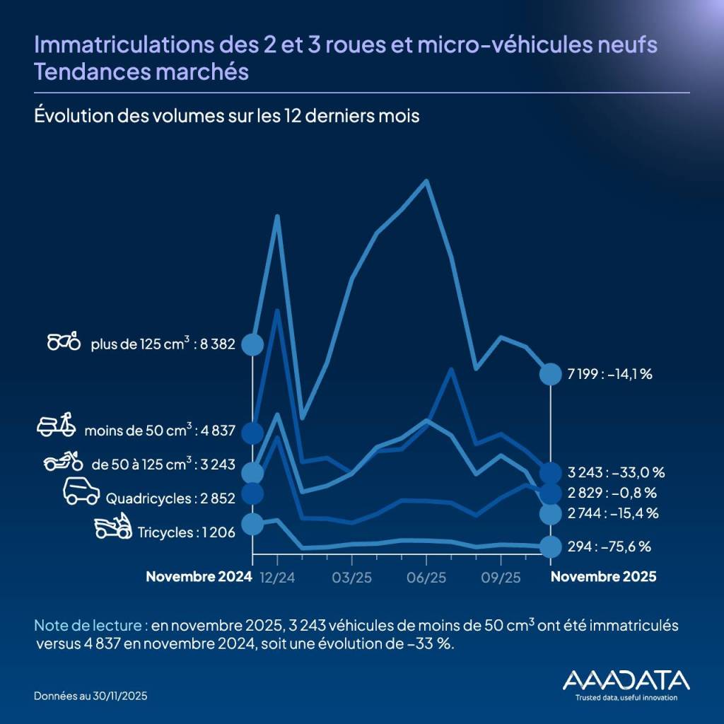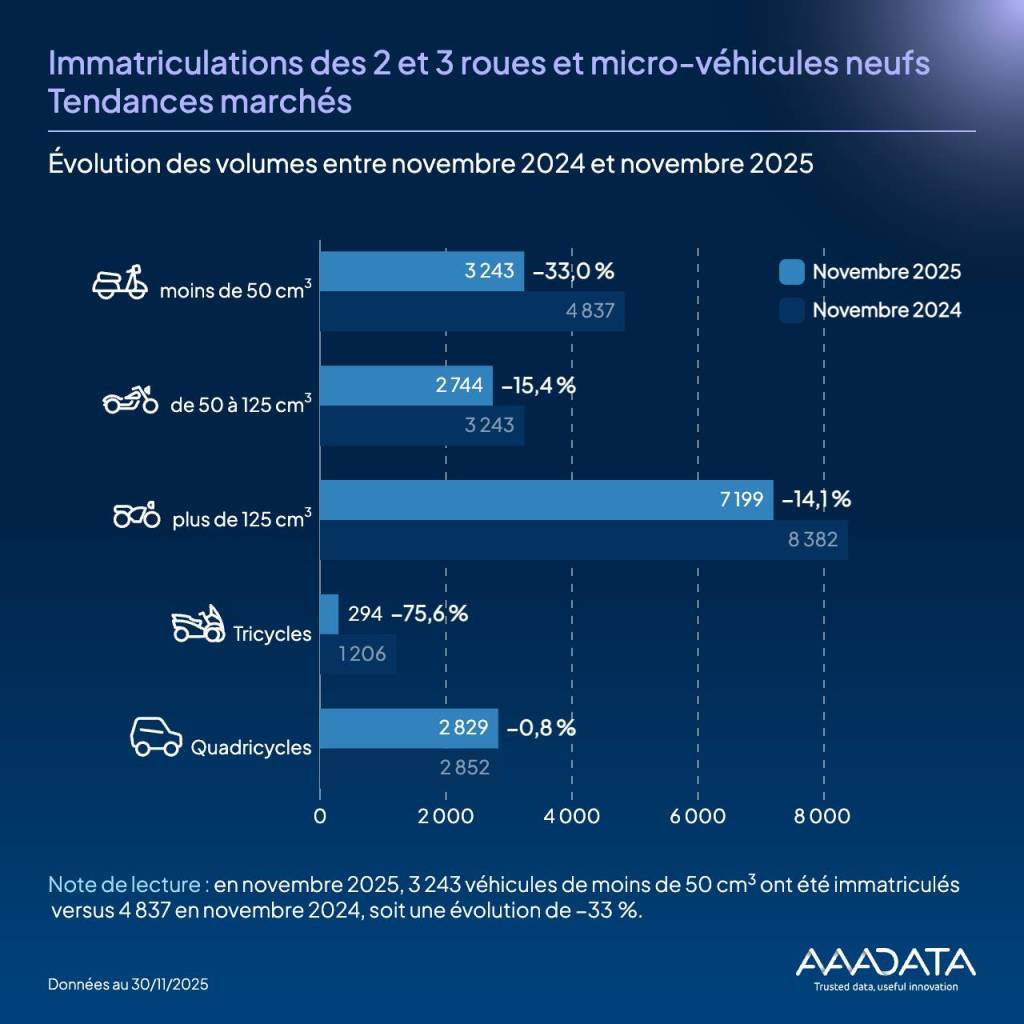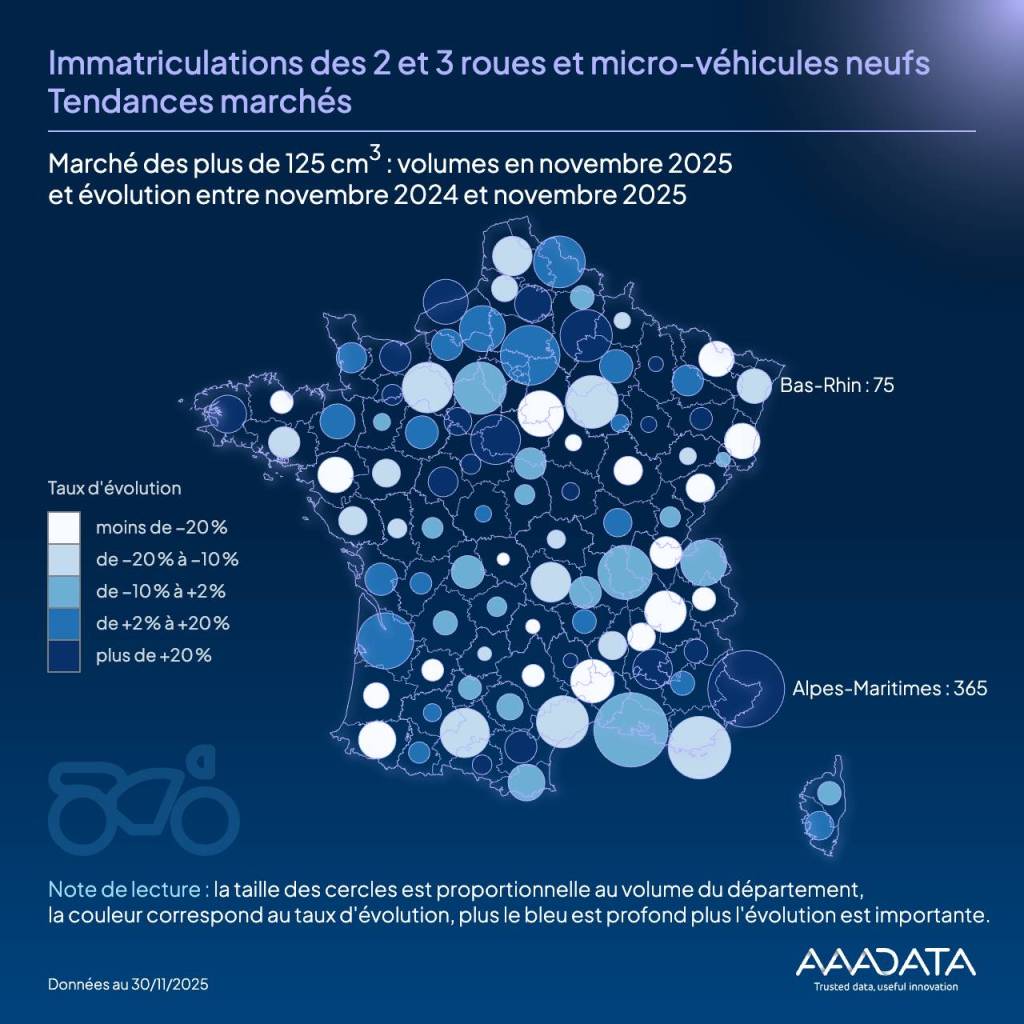 Marché des plus de 125 cm³ : volumes en novembre 2025 et évolution entre novembre 2024 et novembre 2025