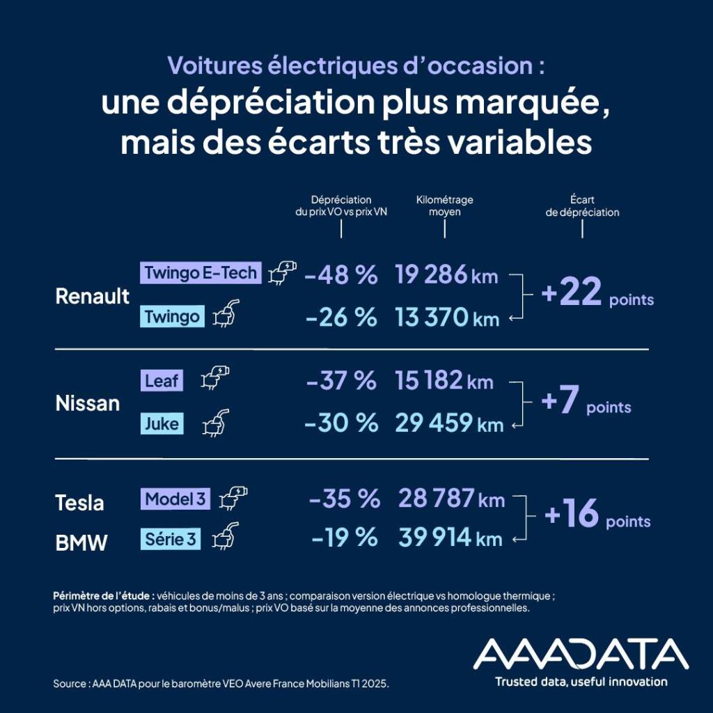 Dans une étude réalisée pour AVERE France Mobilians au premier trimestre 2025, AAA Data s’est intéressé à l’écart de dépréciation des voitures électriques d’occasion de moins de 3 ans, comparée à celle de leurs équivalents à moteur thermique, moins de 3 ans également. Sont pris en compte pour les VN le prix catalogue hors options, hors rabais et hors bonus/malus. Et pour les VO, le prix moyen est issu d’annonces de professionnels. Trois modèles représentatifs ont été retenus : la Renault Twingo, proposée en électrique et en essence, la Nissan Leaf comparée au Nissan Juke et la Tesla Model 3 face à la BMW Série 3.Il ressort de cette étude que la dépréciation des modèles électriques est bien plus rapide, mais avec d’importantes nuances. Ainsi la différence est la plus forte pour la Twingo, puisque la version électrique perd 48 %, contre 26 % seulement pour son homologue à essence, mais avec un kilométrage moyen bien plus élevé (19 286 km en électrique contre 13 370 km en essence). L’écart est le plus faible entre les deux modèles Nissan (- 37 % pour la Leaf contre – 30 % pour le Juke), mais la compacte électrique n’affiche que 15 182 km en moyenne contre près du double pour le petit SUV thermique. Enfin la Tesla Model 3 se déprécie en moyenne de 35 % avec un kilométrage moyen de 28 787 km, qui correspond à son usage plus routier, tandis que la BMW Série 3 ne perd que 19 % avec un kilométrage encore plus élevé (39 914 km).