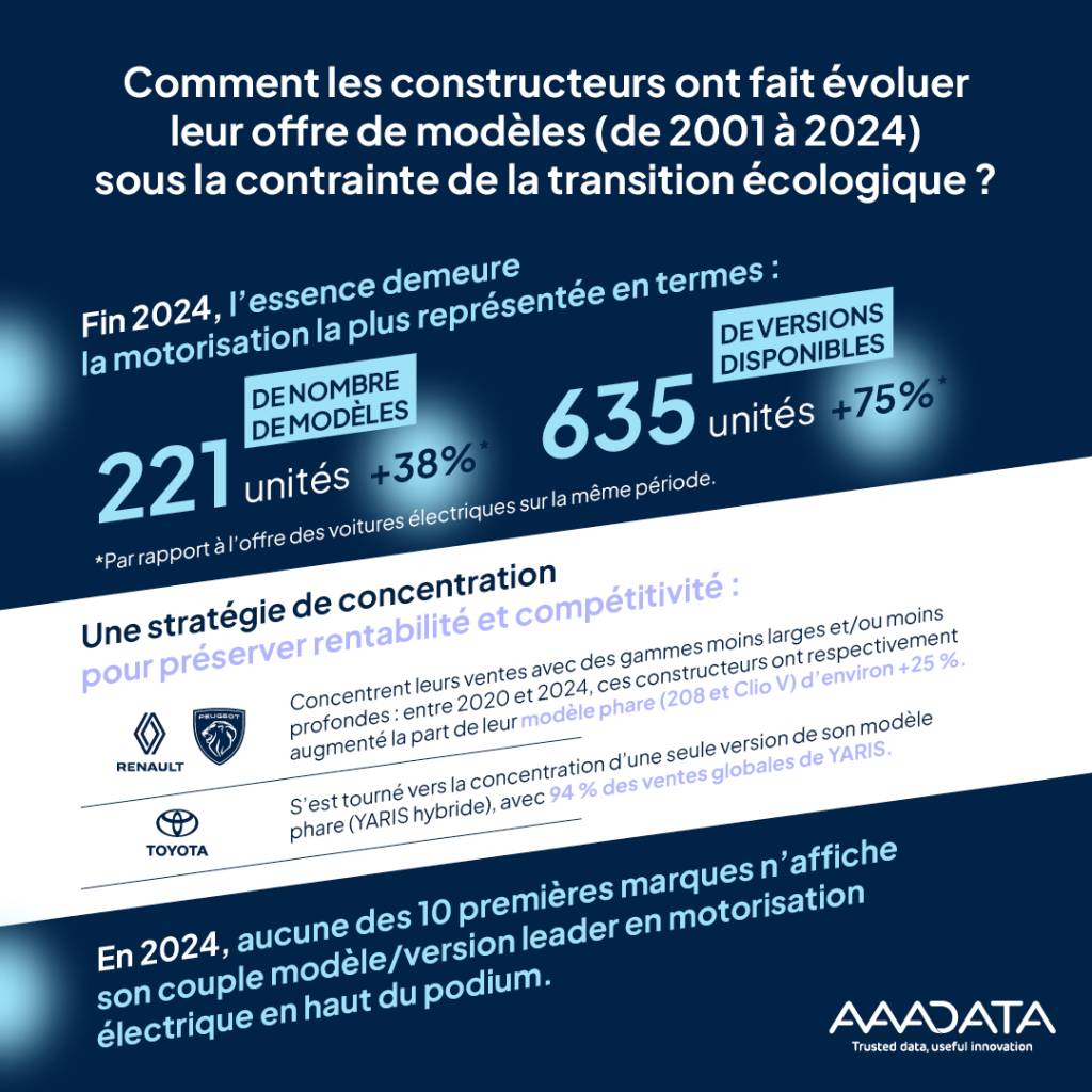 Dans un contexte de niveaux d’immatriculations globalement plus modérés, les constructeurs privilégient des stratégies leur permettant de préserver rentabilité et compétitivité. Cette orientation contribue donc à renforcer leur présence sur les segments à plus forte valeur ajoutée, tels que les SUV, et à ralentir la disparition des moteurs thermiques. En outre, nous observons un processus de concentration de l’offre de modèle disponible au niveau de la marque, avec des gammes moins larges et/ou moins profondes : par exemple Peugeot et Renault ont augmenté la part de leur modèle phare (respectivement 208 et Clio V) d’environ +25 % entre 2020 et 2024 ; Toyota a choisi une stratégie différente mais toujours tournée vers la concentration : la part du modèle phare (YARIS) a diminué mais les ventes de ce modèle se concentrent sur une seule version, la Yaris hybride, 68 ch, boîte mécanique, soit 94 % des ventes globales de Yaris. En 2024, aucune des 10 premières marques n’affiche son couple modèle/version leader en motorisation électrique sur la première marche du podium.