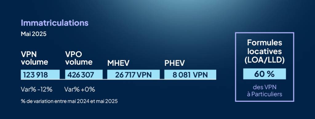 Presque tous les indicateurs sont au rouge sur le mois de mai. Avec des commandes de voitures particulières neuves en baisse de 11 % selon les données du CCFA (janvier à mai 2025 vs 2024), nous n’attendons pas de redressement de la tendance des immatriculations dans les prochains mois. Les changements de politiques publiques ont rendu les acheteurs prudents et les opportunistes attendent le leasing électrique annoncé pour septembre et les certificats d’économies d’énergie (CEE), le nouveau « coup de pouce » du gouvernement en remplacement du bonus écologique. Il devrait entrer en vigueur en juillet 2025.