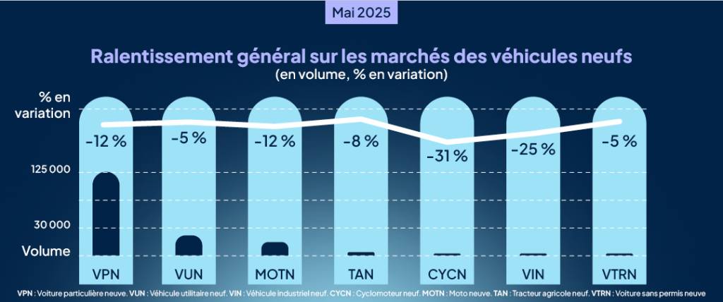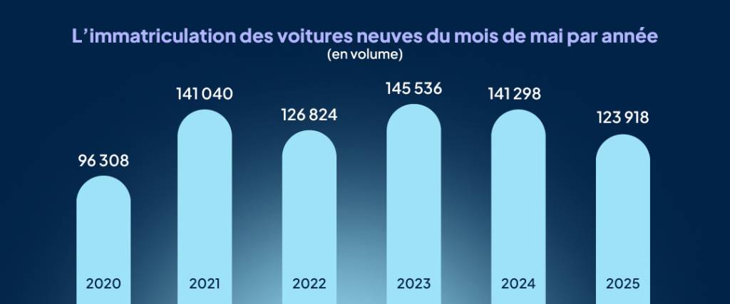 La faiblesse de la demande s’avère persistante en 2025. Avec un nombre de jours ouvrés identique, le marché français des voitures neuves perd 12 % en mai et accentue son recul depuis le début de l’année (- 8 %).