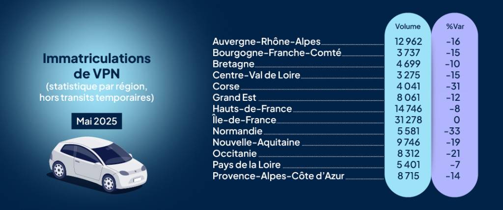 L’évolution des ventes de voitures neuves connait une grande disparité entre les régions. Les ventes de l’Île-de-France se maintiennent alors que celles des régions Normandie, Corse, Occitanie reculent plus fortement que le marché total (-12 %).