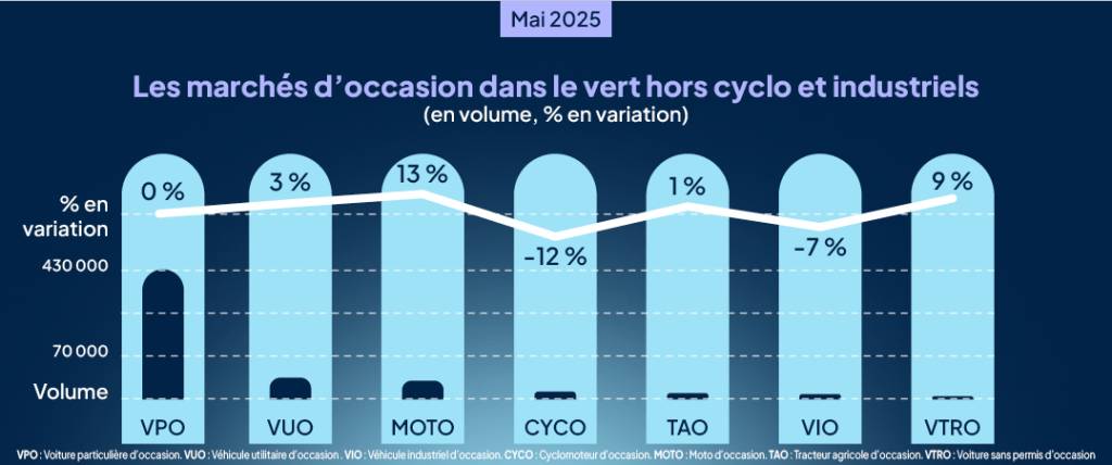 Redevenu plus attractif par rapport au neuf, le marché de l’occasion bénéficie d’une offre enrichie de modèles récents à des prix plus raisonnables après plusieurs années de forte inflation. En solide progression depuis le début de l’année, il subit pourtant un coup d’arrêt en mai (+0,3 %) avec 426 307 transactions.