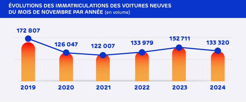 La tendance observée depuis le début de l’année confirme un marché de la voiture en repli pour 2024. La baisse est actuellement -4 % (1, 5 million d’immatriculations au cumul de janvier à novembre 2024).