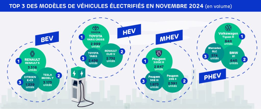 Les hybrides non rechargeables (HEV, hors microhybrides) en représentent la majorité (21 % du marché) et gagnent 8 %. Les hybrides légères (MHEV) enregistrent le plus fort gain (+ 71 %) pour atteindre une part globale de 19 %. Quant aux hybrides rechargeables (PHEV), qui devraient perdre plusieurs de leurs avantages fiscaux en 2025 (malus au poids, taxe annuelle sur les émissions de CO2 pour les entreprises), ils reculent de 20 % et restent à 9 % du marché.