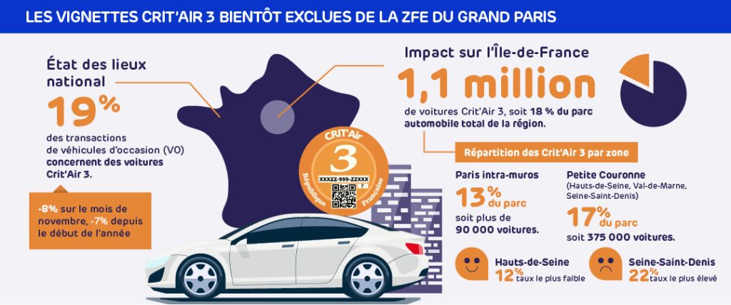 La part des voitures Crit’Air 3 dans le parc roulant reste significative alors que la ZFE du Grand Paris s’apprête à les exclure d’une large zone incluant Paris et potentiellement 76 communes situées en totalité ou en partie dans le périmètre de l’A86 à partir de janvier.